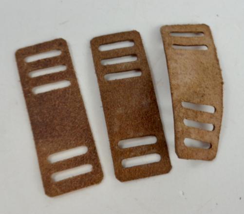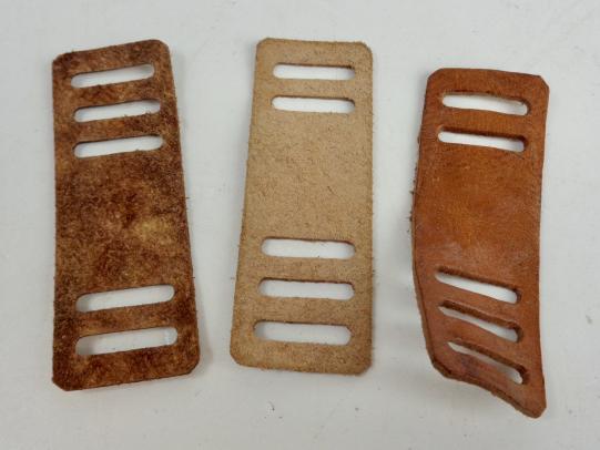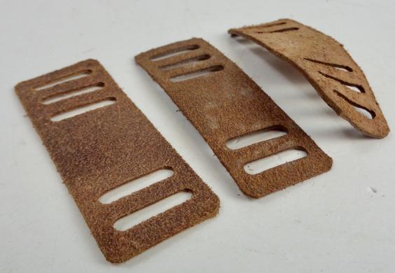 Wehrmacht re-enforcement Leathers Gasmask Strap Mint un-issued set of three re-enforcemend leathers for Wehrmacht gasmask cannisters straps. In mint condition. Impossible to find!!!