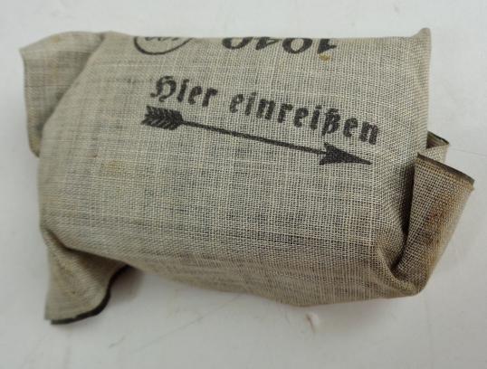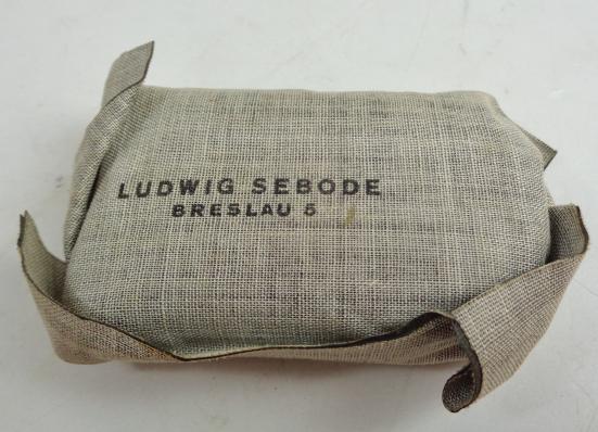 Wehrmacht First Aid Bandage Nice small package of Wehrmacht first aid bandage. Nicely dated “1940” made by “Ludwig Sebode, Breslau 5” in very good condition.