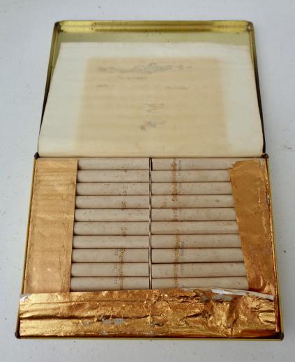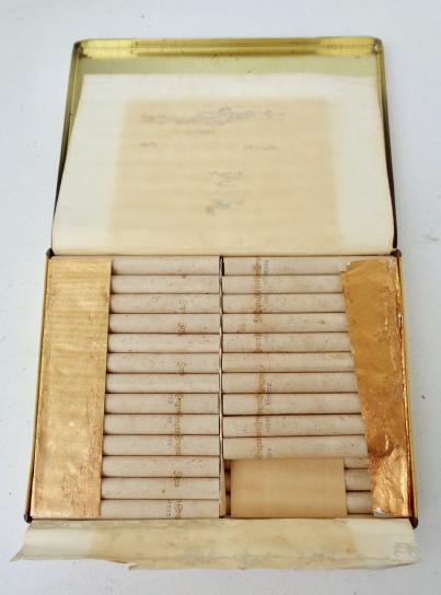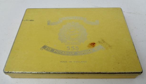 British Metal Cigarette Can Decorative metal can “State Express 555” number one cigarettes. Nice big version metal can with 97% original content! Ony three were smoked. Nice can in good condition.