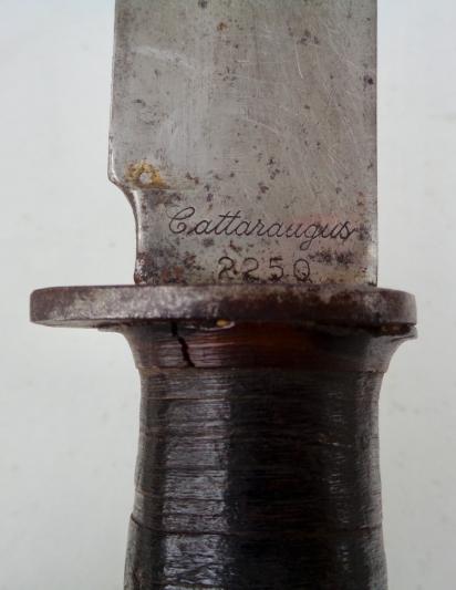 US WW2 Cattarouges 2250 Combat Knife Nice used US WW2 combat knife in leather scabbard. Made by “Cattarouges” model 2250. Nice heavy made combat knife in used but good condition.