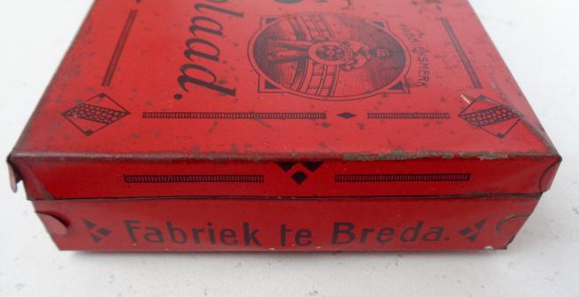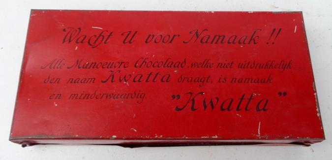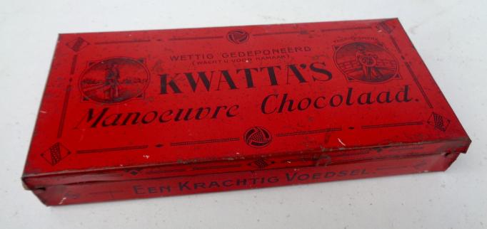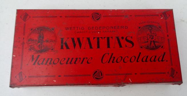 Dutch pre WW2 Chocolade Tin "Kwatta's Manoeuvre Chocolaad" Nice original metal can in original paint. In good condition!