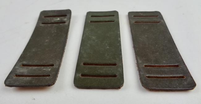 Wehrmacht re-enforcement Leathers Gasmask Strap Mint un-issued set of three re-enforcemend leathers for Wehrmacht gasmask cannisters straps. In mint condition. Impossible to find!!!