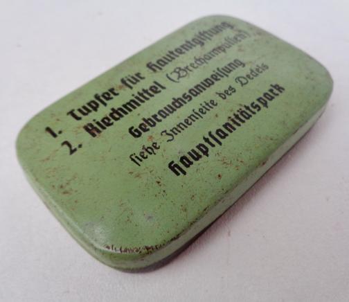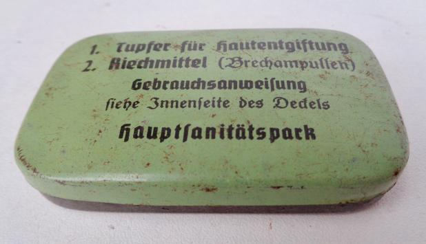 Wehrmacht metal Medical Can Very nice little metal Wehrmacht can With tube “Hautentgiftungs mittel” and 2 “Smelling Ampoules” nicely marked “Hauptsanitätspark” Very nice metal can in very good condition.