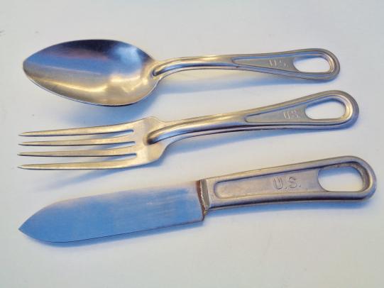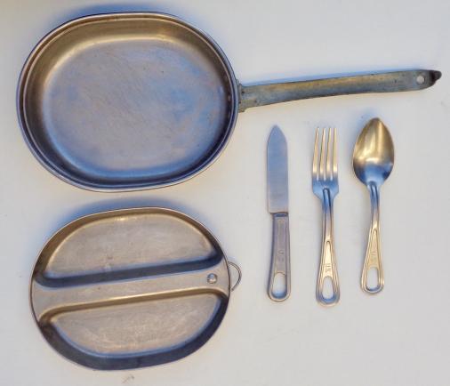 US WW2 mestin and US fork, spoon and knife. Mestin dated “1942” All in perfect condition.