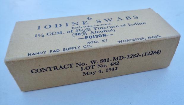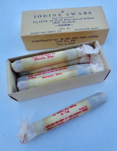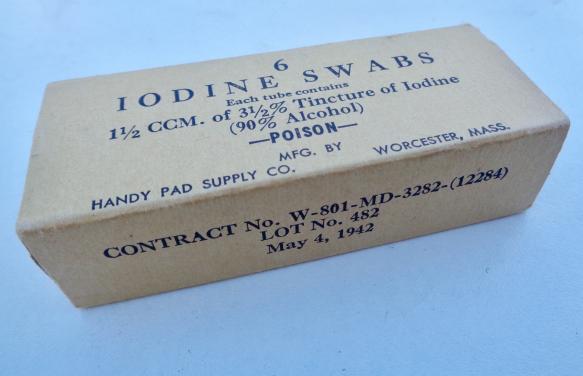 US WW2 Medical Iodine Swabs Nice carton box with content (6 swabs) Nicely dated “May 4, 1944” In very good condition.