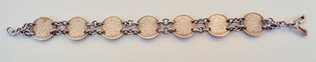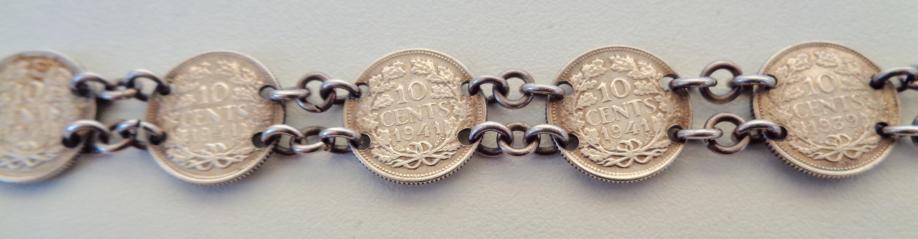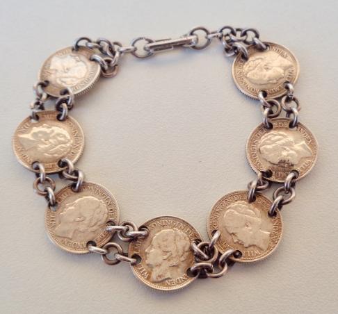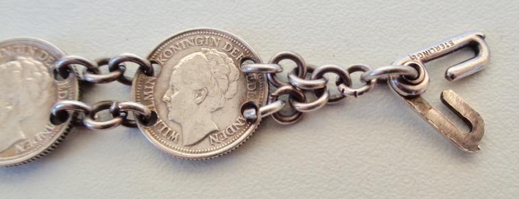 Very nice “Stirling silver” Dutch wartime bracelet, made of silver dimes with “Dutch Queen Wilhelmina” on one side of each dime. These bracelets were a symbol from the Dutch people that they were loyal to the Dutch Royal Family instead of loyal to the Germans. Very nice “Sterling silver” bracelat in very good condition.