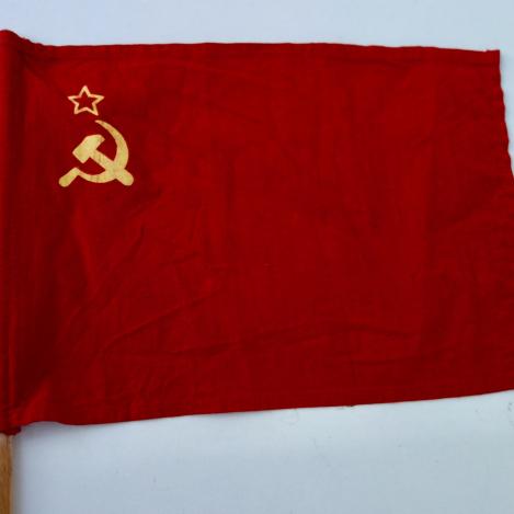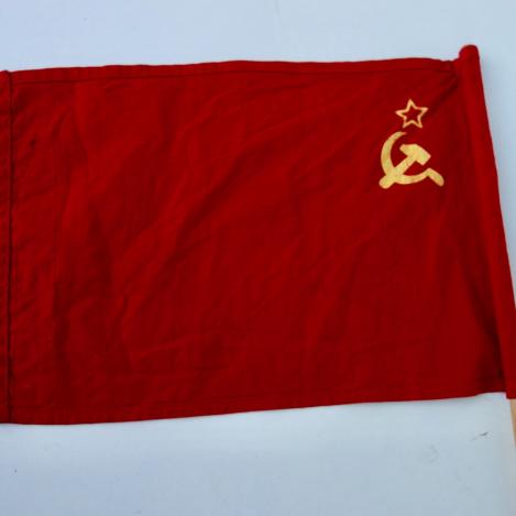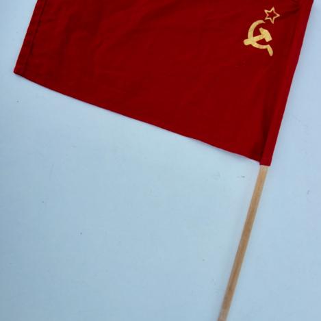 Soviet Signal Flag Small Soviet signal flag on wooden stick. With printed Soviet Star, Hammer and Sickle. In used but very good condition.