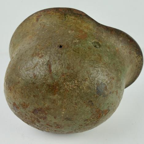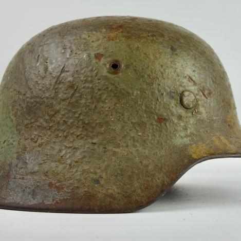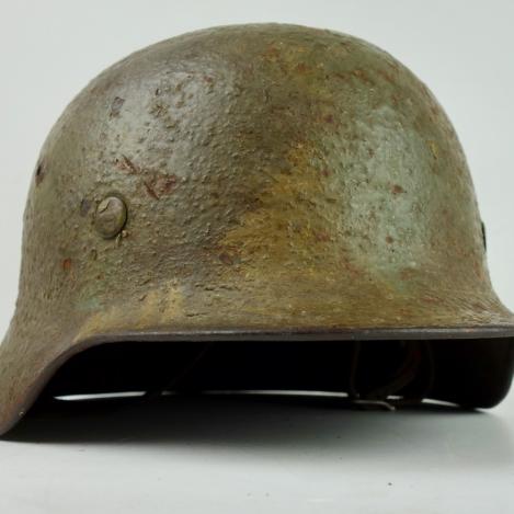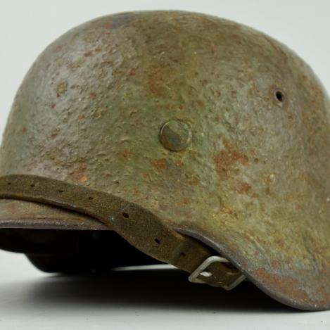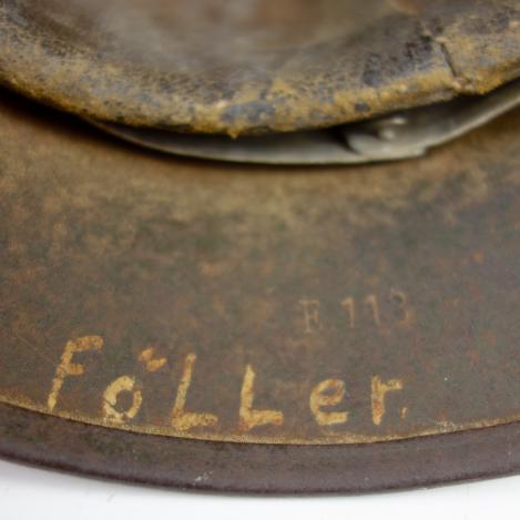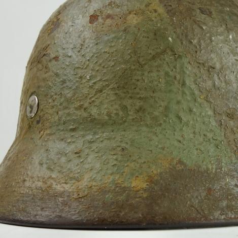 Very nice combat used Wehrmacht M35 three tone saw dust camo helmet. With its original second model aluminium liner in size “57” and leather early combat helmet strap with aluminium buckle. De steelpot is named inside, “Föller” and maker code marked “NS” which is “Vereinigte Deutsche Nickelwerke AG, Schwerte” and the steelpot size is “64”