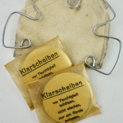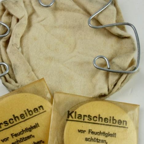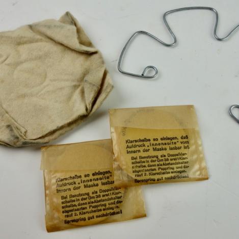 Wehrmacht M31 Gasmask Cleaning Cloth Spring Nice used cleaning cloth spring for the M31 gasmask With two packages of "Klarscheiben" Nice set to complete your M31 gasmask In perfect condition.