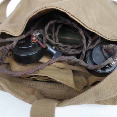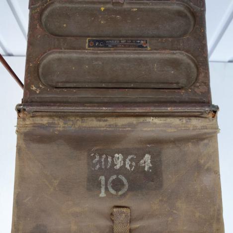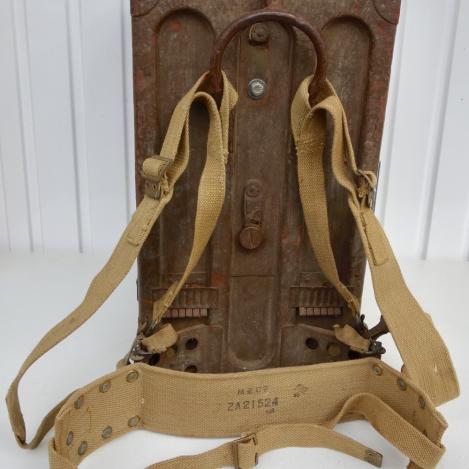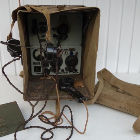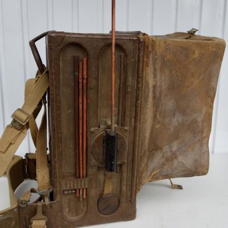 Very nice British WW2 Wireless 18 set 1e model with all accessories as Headphone, Microphone, Spare Tube, Satchel Bag and all Antennas. complete with waist belt and straps.