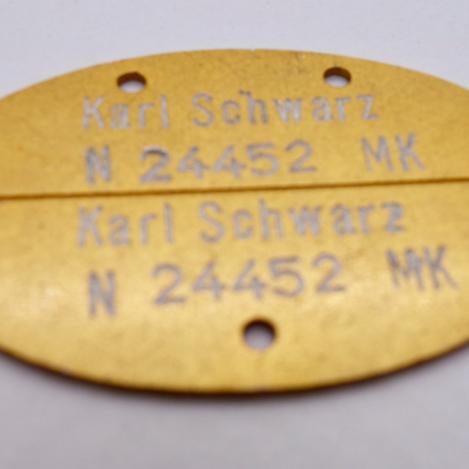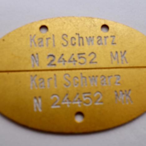 Kriegs Marine Dog-tag (E-Marke) with a "North Sea" number "N. 24452 MK" On name "Karl Schwartz" In 100% gold finisch and white letter. In very good condition.
