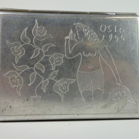 Wehrmacht Cigarette Case Nice field engraved Wehrmacht aluminium cigarette case. “Oslo” (Norway” dated “1944” In used but very good condition.