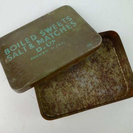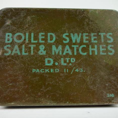 British WW2 Field Ration Metal Can “Boiled Sweets, Salt & Matches” Marked “D, Ltd” dated “2/43” In very good condition.