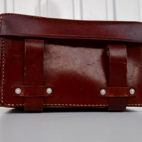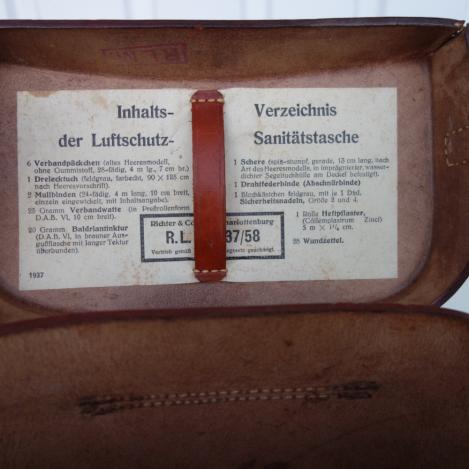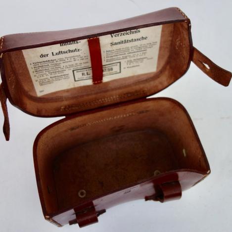 Luftschutz Medic Pouch Near mint early leather Luftschutz medic pouch. Made by “Richter & Co.” And “Waffen Ambt.” stamp. The pouch has its original paper label inside. Nice big pouch in very good condition.