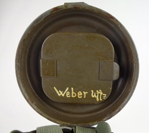 And inside the cannister is dated “1939” and named “Uffz Weber” (NCO) the spring to stretch the gasmask is not included!