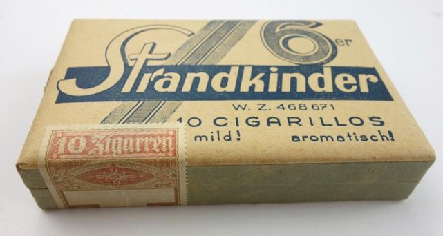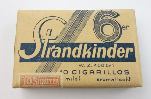 Wehrmacht era Cigars Nice carton cigar box with content, never being opened. “6er Strandkinder” cigarillos With original paper seal, with eagle/swastika sign. Nice box in very good condition.