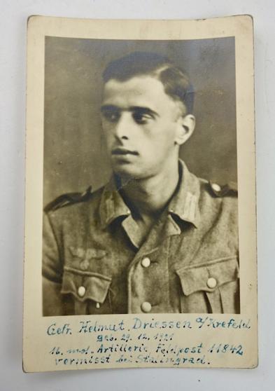 Nice send German WW2 postcard with an Wehrmacht soldier “Gfr. Helmut Driessen” who was missing in action at “Stalingrad” while serving an Artillery unit,