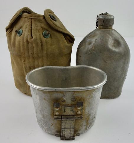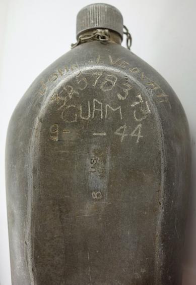 Nice used US WW1 canteen with WW1 cover and WW2 cup (1942) the canteen is WW2 used and nicely named “John Viovitti” and “Guam 9-1944” so was used in the Pacific against Japan.