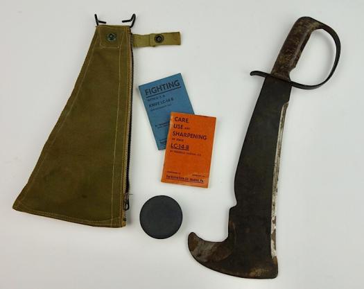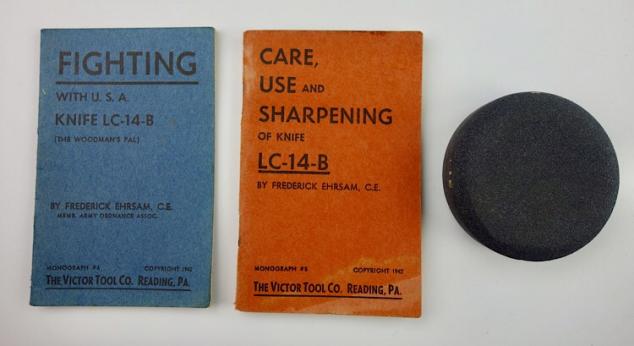 Very nice US WW2 “Woodman’s Pal” survival tool in its original pouch and two instruction booklets (Fighting and Use and Care) and the original sharpening stone. Nice and rare US WW2 survival tool in extreem nice condition.