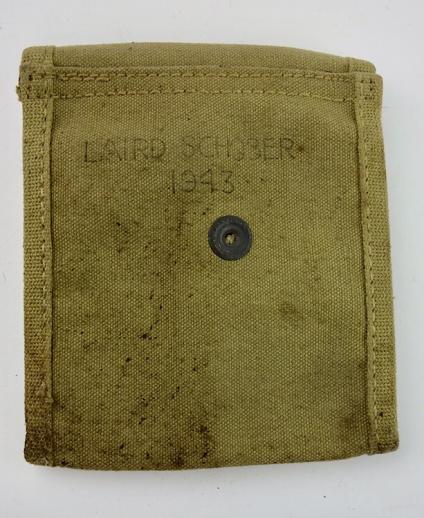 US WW2 M1 Carbine Pouch Nice pouch for two 15 round .30 Cal. M1 Carbine box magazines, made by “Laird Schober” and dated “1943” in near mind condition. (Little dirt on it) Hard to upgrade!