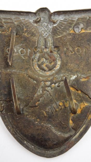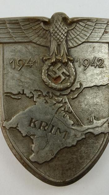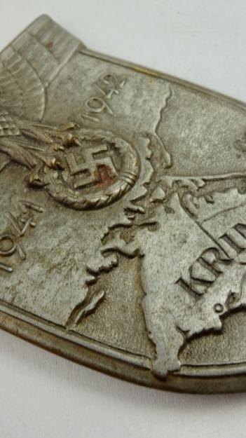Krim Shield Award for the German forces fighting in the “Krim” pocket. One of the four pins on the back is broken and the back plate and wool are gone, but overal the “Krim” shield is in good condition.