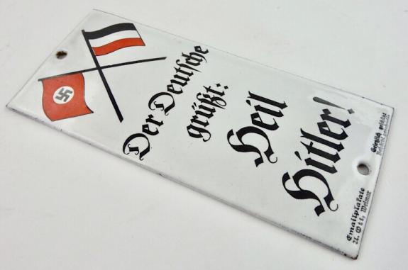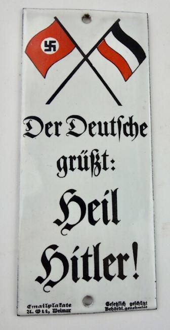 Third Reich Nazi Sympahtizer enamel Door shield “Der Deutsche Grüst, Heil Hitler” Nice small size enamel front door shield, size about 15 cm high and 6/7 cm weight. In good condition.
