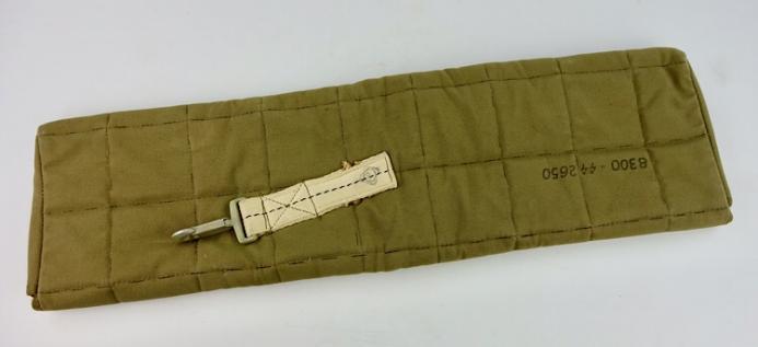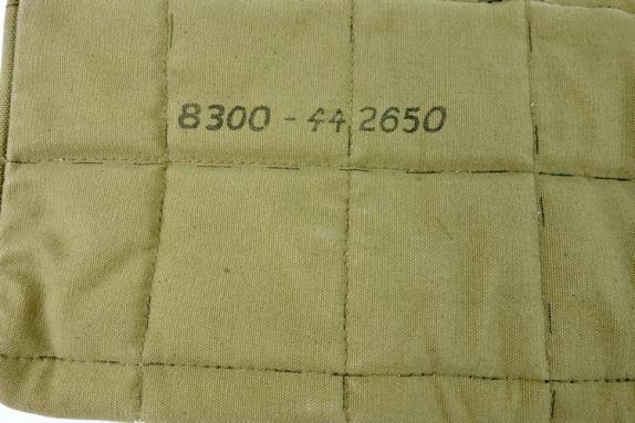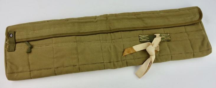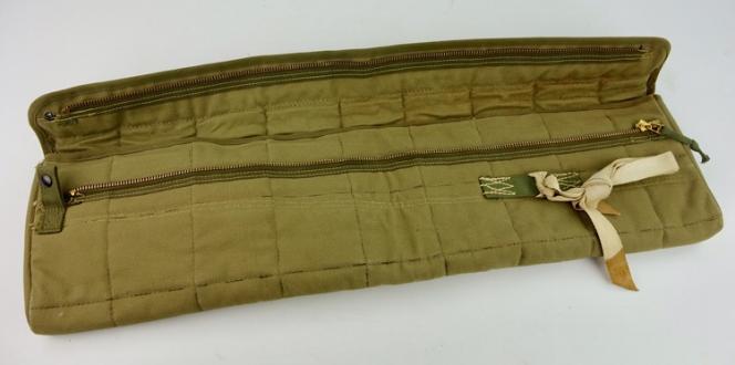 The bag is made to klik on the US T5 parachute harness and hold the US M1 Garand rifle in two pieces during a combat jump. Dated “1944”