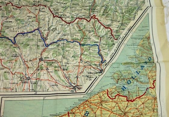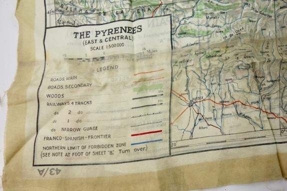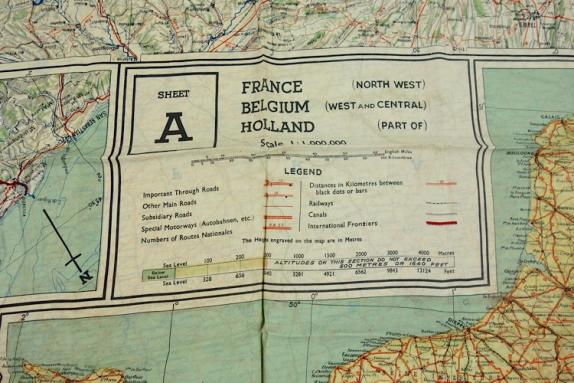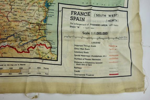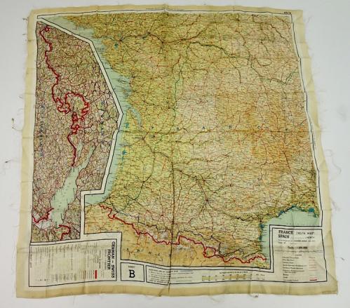 Very nice silk made British/US escape map, used by Air crews, secret agents, special forces like Airborne troops or SAS commando's. This map is about "France, Belgium and Holland" Sheet "A" and "France and Spain (The Pyrenees)" Sheet "B" The escape map is in very good condition. Impossible to upgrade!!!