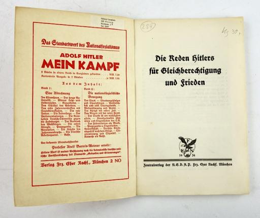 Third Reich Booklet Adolf Hitlers Speeches Nice used Third Reich booklet with “Adolf Hitlers” speeches. “Die reden Hitlers für Gleichberechtigung und Frieden” In good condition.