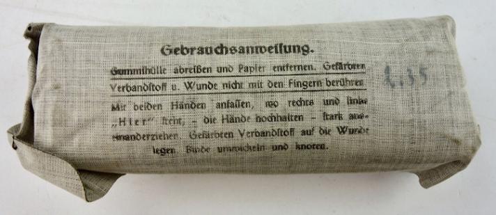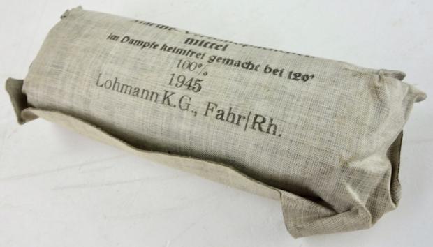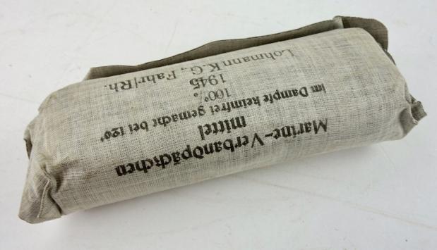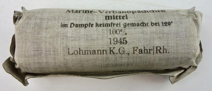 Kriegsmarine First Aid Wound Bandage Very nice and rare to find Kriegsmarine first aid wound bandage. Dated “1945” made by “Lohmann K.G., Fahr/Rh.” In near mint condition.