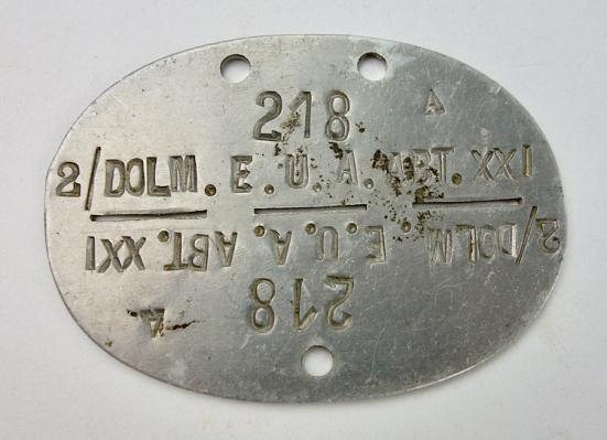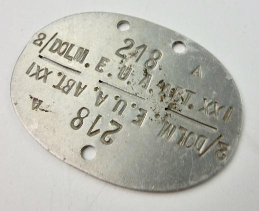 from a Wehrmacht Translator "218 2/Dolm. E.u.A. Abt. XXI" and with blood type "A' Very nice and very rae to find Wehrmacht Dog-Tag in very good condition.