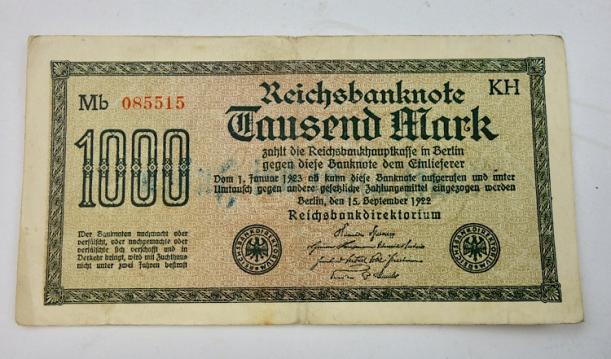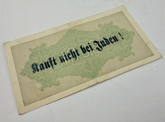 Very rare early 1930's Third Reich bank note of 1000 Reichs Marks, reprinted on its back with anti Jew propaganda "Kauft nicht bei Juden!" (Do not buy from Jew's) in used but very good condition!