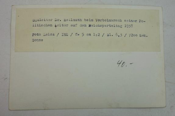 Propaganda Company Press Photo Very nice Wehrmacht Propaganda Company press photo with Gauleiter Dr. Hellmuth at the parade of his Political leaders on the "Reichspartijtag 1938" In very good condition.
