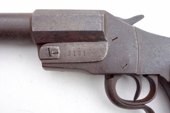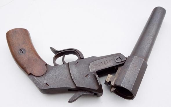 Very nice Imperial German “Hebel” flare gun model “1894” With matching numbers “43181” in the frame and in de screw, and maker code marked “CLR” Very nice flare gun in used but good condition.