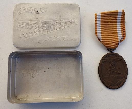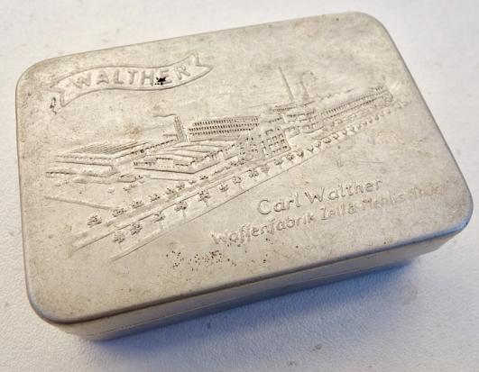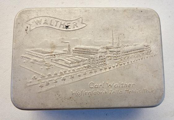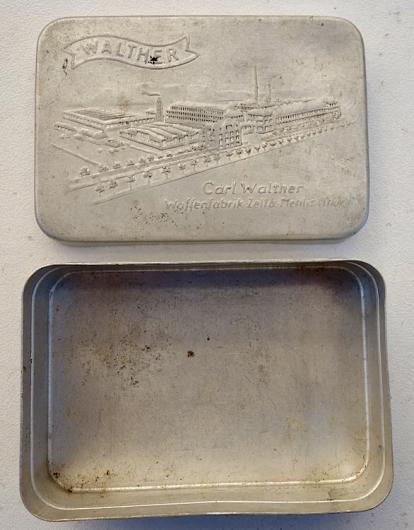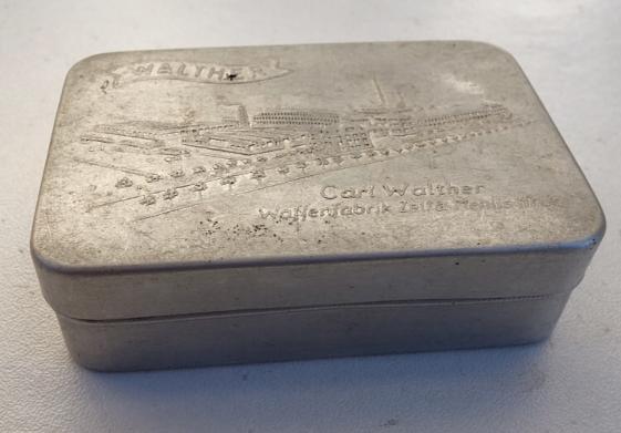 Aluminium little Box with Carl Walther Engraving Very nice little aluminium made box (size of a match box) with nice “Carl Walther, Waffenfabrik” engraving. In very good condition.