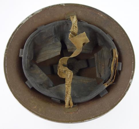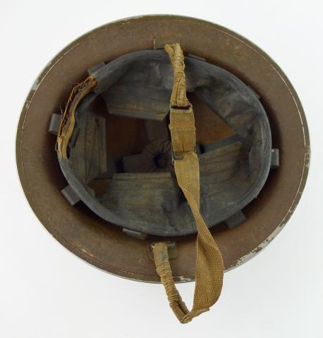 Nice used Canadian (Brodie type) helmet with decal of the “Royal Canadian Ordonance Corps” complete with its original liner and combat helmet strap.