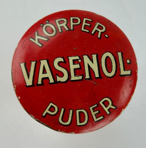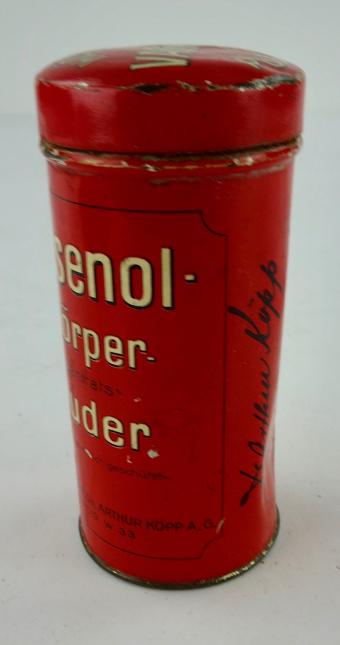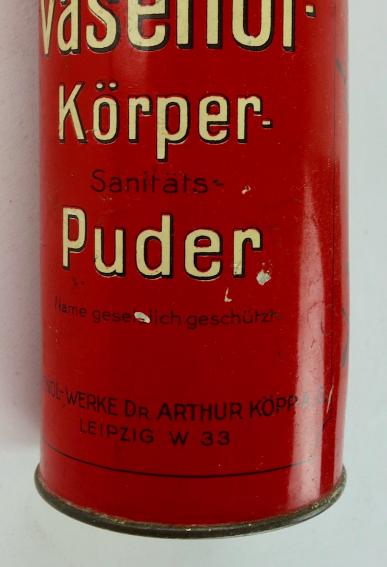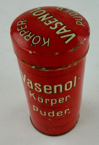 Wehrmacht Foot Powder "Vasenol" Original metal can with content of "Vasenol" foot powder Made by "Vasenol-Werke Dr. Arthur Koppf, Leipzig" In good condition!