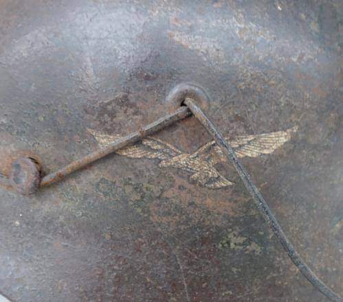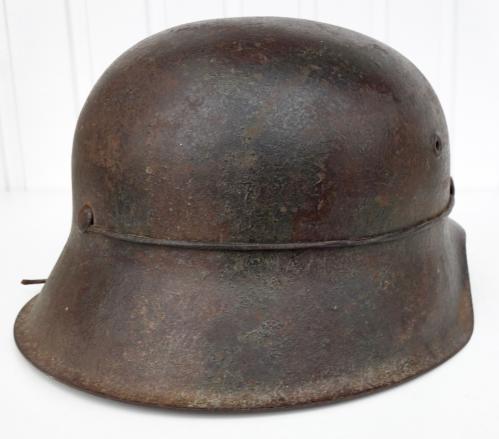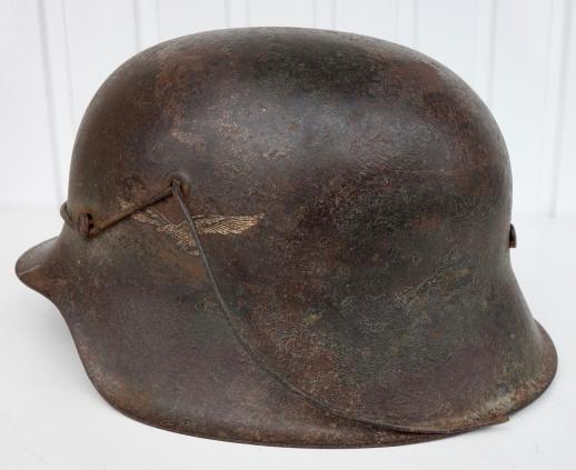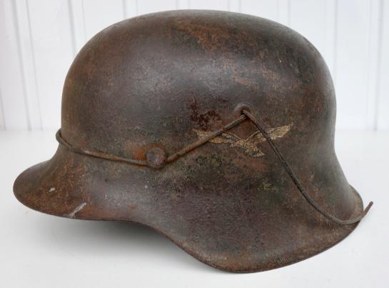 Very nice salty Luftwaffe M42 SD killer combat helmet with leather (wire) strap, camo and a great battle look!!