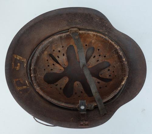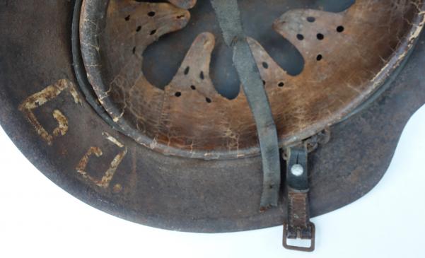 Marker marking impossible to see becauce of the camo paint. Size about “57” The steelpot has initials painted inside from the soldier who did wear this helmet. Overal a nice two tone camo with a leather (wire/strap) and complete with leather combat helmet strap. In nice salty combat used condition.