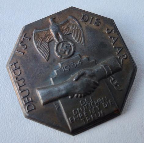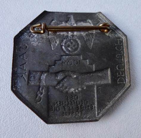 SA metal Pin (Deutsch ist die Saar) Very nice metal pin in very good condition “Deutsch ist die Saar” dated “1934” “Des Deutsche ehre ist die Treue” Nice SA pin, which you do not find often!