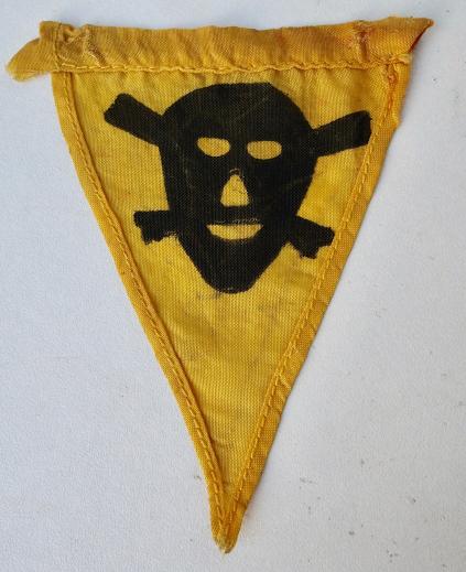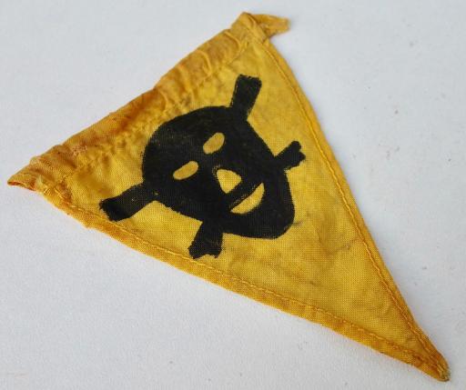 Wehrmacht Mine Flag Nice little bone and skull “Mine” flag. To mark land mines. Photographs know US WW2 “GI’s” did where them, when found under there helmet net. In used but very good condition.