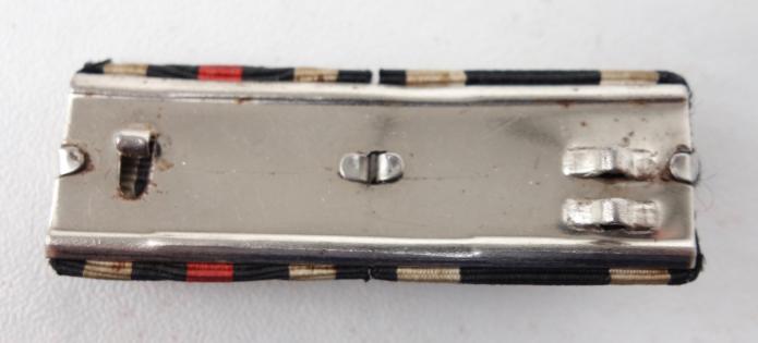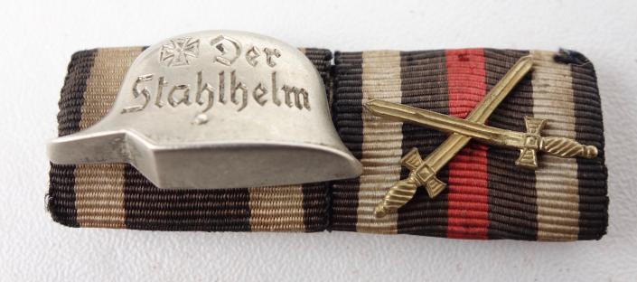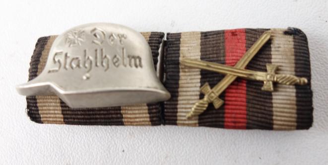 Nice WW1 ribbon bar with “War remembrance Cross ribbon with swords” and “Iron Cross second class 1914 ribbon” with “Stahlhelm Bund” badge on top.
