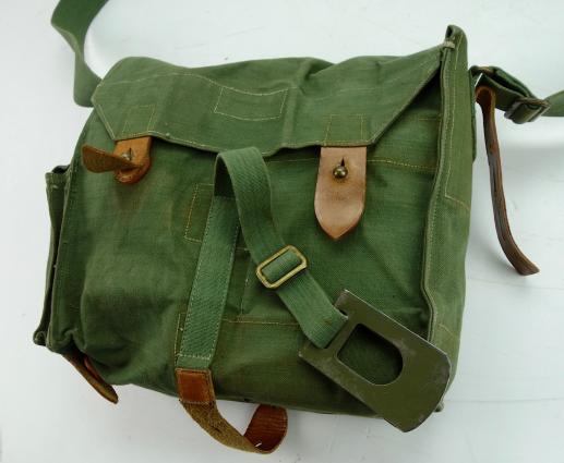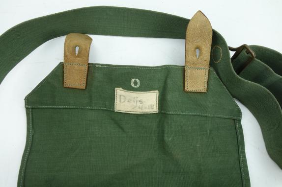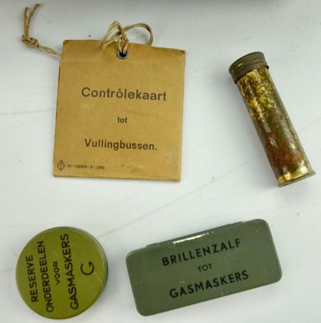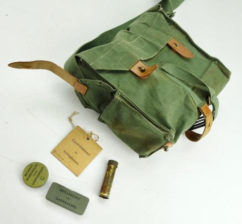 Impossible to upgrade Dutch (onbereden) Gasmask in mint pouch. With original control card, cleaning cloth in original tube, ointment in metal container and spare parts container. Pouch is mint and named with cloth label “Deijs” and marke “0” for “onbereden” (infantry man) impossibly to upgrade!!!