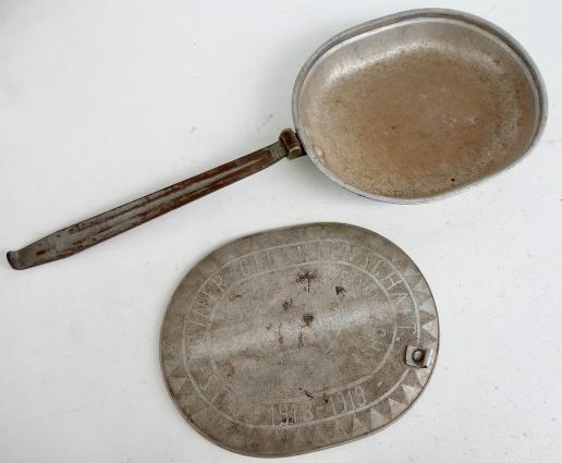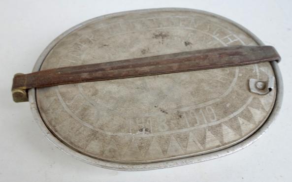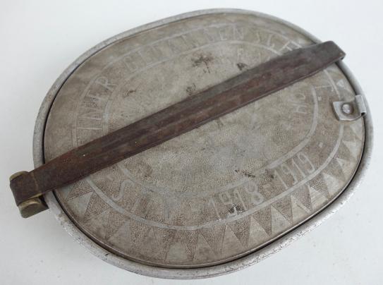 Very nice US WW1 canteen with German WW1 prisoner of war art. The lid fully engraved in a fantastic style by a German WW1 prisoner of war.