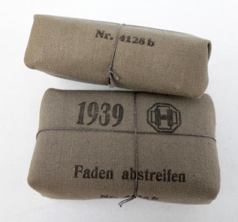 2x Wehrmacht Wound Bandage 1939 Nice mint Wehrmacht wound bandage. Would be one in the inside pocked of every Wehrmacht combat tunic, “1939” dated In mint condition.