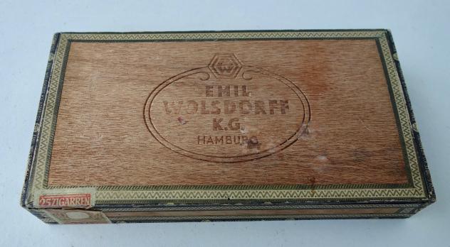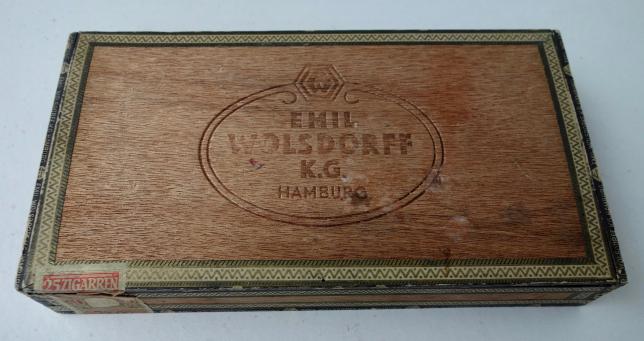 Wehrmacht era Cigar Box Nice Wehrmacht era wooden cigar box “Emil Wolsdorff KG Hamburg” Nice wooden cigar box for 25 cigars, with original “Third Reich” seal. In used but good condition.