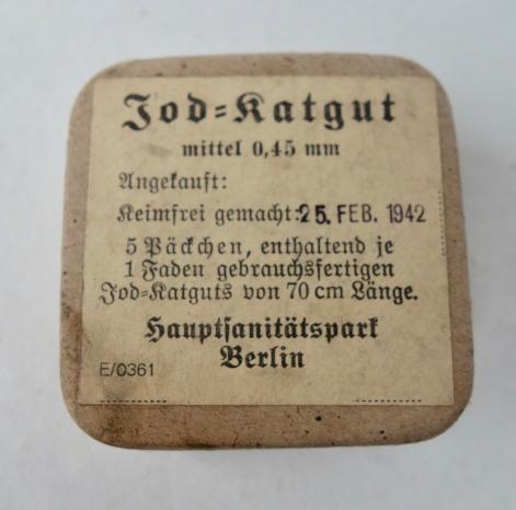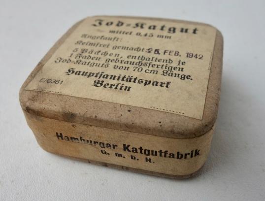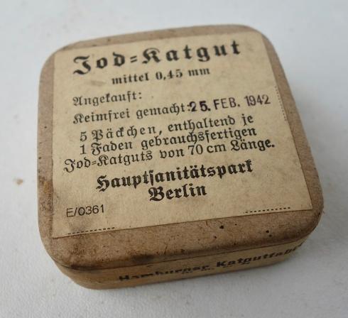 Wehrmacht Medical Sature Jod-Katgut 5 packages in this original carton case of Wehrmacht sature. Jod Katgut Dated "1942, Hauptsanitätspark, Berlin” In very good condition.