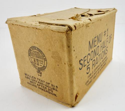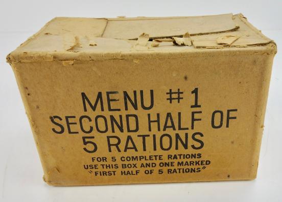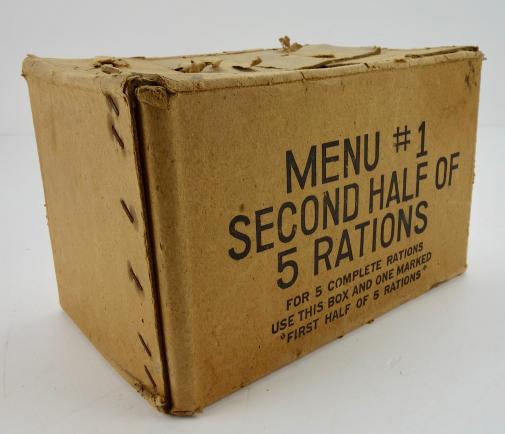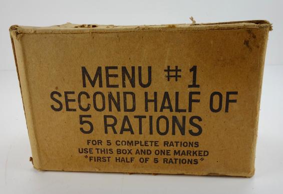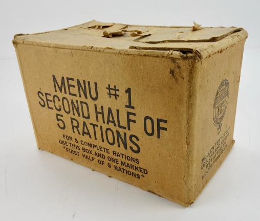 US WW2 Ration Box Very nice original US WW2 cartboard ration box. “Menu 1, second half of 5 rations” Very nice decorative box, perfect for display. In very good condition.