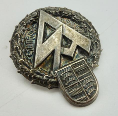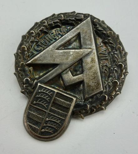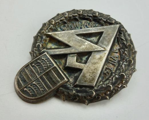 SA metal Stuttgart Badge 1-7-1934 Very nice metal SA (Sturm Abteilung) “Stuttgart” rally badge of “1-7-1934” very nice big SA badge in very good condition.