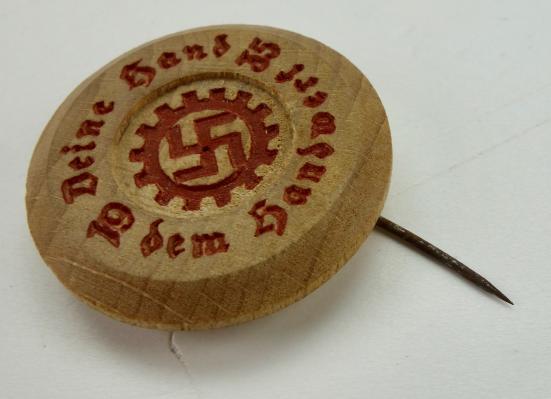 DAF Stick Pin Deutsche Arbeids Front Nice wooden made DAF stick pin. “Deine Hand, dem Arbeid” dated “1935” In very good condition.
